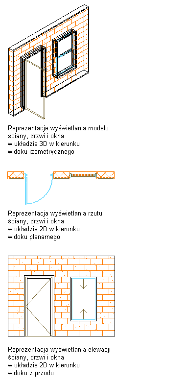 Pojedynczy obiekt może być narysowany różnymi sposobami, w zależności od potrzeby różnych typów rysunków. Na przykład reprezentacja wyświetlania typu plan umożliwia rysowanie komponentów panelu drzwi, ramy, ogranicznika i łuku otwarcia. Nominalna reprezentacja wyświetlania umożliwia rysowanie komponentów panelu drzwi, ramy i łuku otwarcia. Mimo że obie reprezentacje umożliwiają rysowanie panelu drzwi, to każdy rysunek jest inny. Reprezentacja typu plan rysuje panel drzwi w postaci prostokąta, podczas gdy reprezentacja nominalna jako pojedynczą linię.