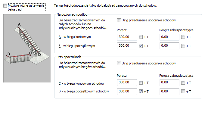 w polu Na spocznikach, wprowadź wartości opcji: Poręcz i Poręcz zabezpieczająca. Wybierz opcję + T obok wartości, aby dodać długość stopnicy do przedłużenia. |
