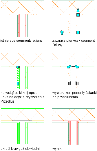 Opisana poniżej procedura pozwala zmodyfikować przenikanie ścian poprzez wydłużenie komponentu. Granicę wydłużenia może stanowić linia, łuk, okrąg, polilinia lub krawędź komponentu ściany.