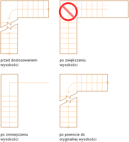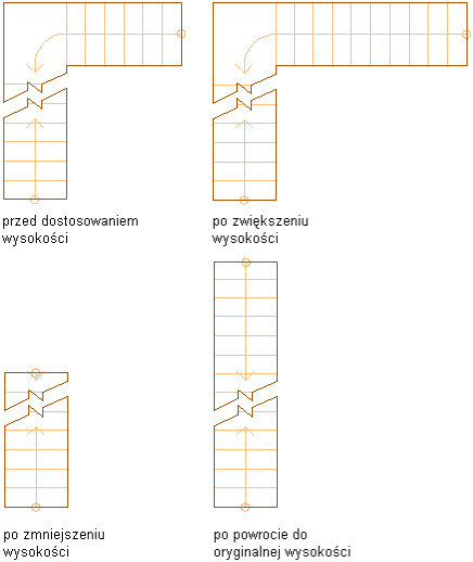 Na rysunku poniżej pokazano przykład biegu schodów z wyłączoną opcją StairFit przed i po zmianie wysokości.
