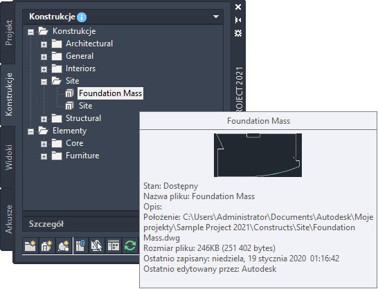 W nawigatorze projektu można wyświetlić miniatury podglądu rysunków projektu. Podgląd może zawierać grafikę, szczegół lub kombinację grafiki i szczegółu. Wyświetlanie miniatur może być pomocne podczas nawigacji w obszernych projektach zawierających wiele rysunków.