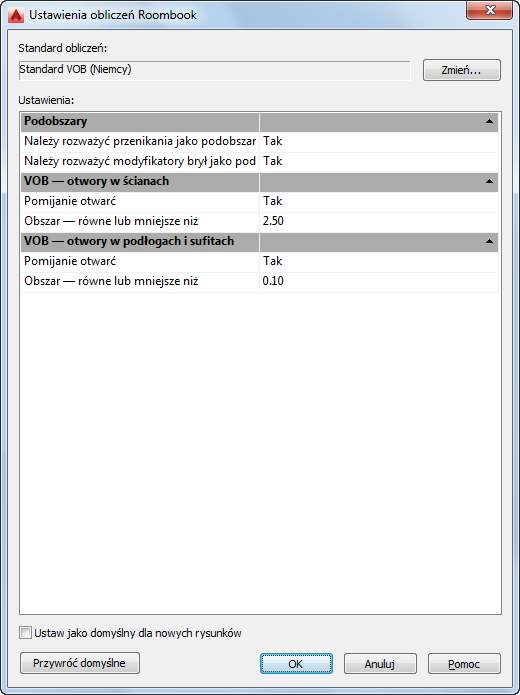 Program Roombook zawiera krajowe standardy obliczeń: