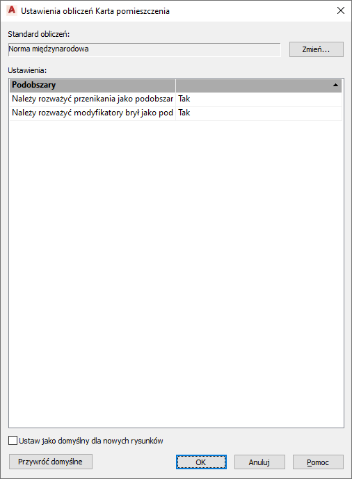 W tym polu jest wyświetlany bieżący standard obliczeń. Aby go zmienić, kliknij przycisk Zmień.