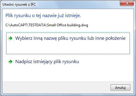 Jeśli wybrany szablon (plik DWT) nie zawiera tych samych jednostek co importowany plik IFC, zostanie wyświetlony monit z pytaniem, czy kontynuować z tym szablonem, czy wybrać inny. Jeśli wybrana zostanie opcja kontynuowania z wybranym szablonem, jednostki w pliku szablonu zostaną nadpisane przez jednostki z pliku IFC.