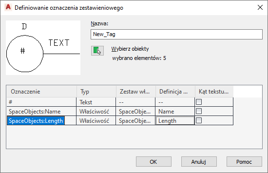 | zbierała dane właściwości z obiektów z oznaczeniami | wybierz Właściwość dla opcji Typ, wybierz zestaw właściwości i definicję właściwości i kliknij OK. |