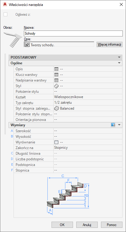 Tworząc narzędzie stylu schodów, należy wziąć pod uwagę wstępne ustawienie następujących właściwości: