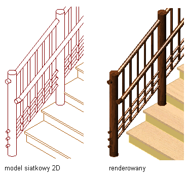Balustrada w modelu siatkowym 2D i widokach renderowanych