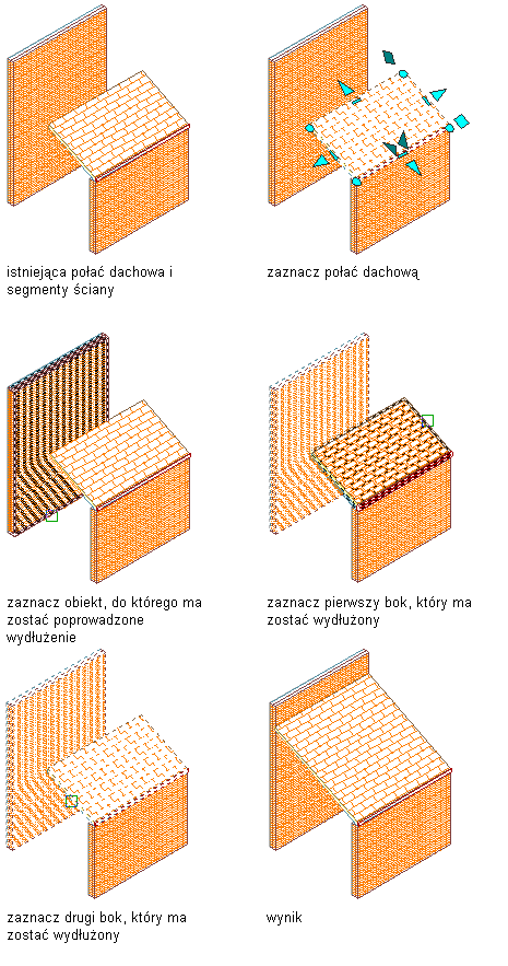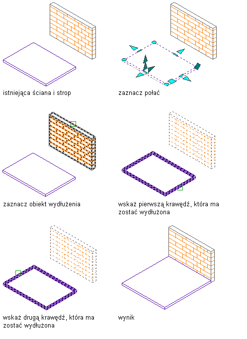 Procedura wydłuża strop lub połać dachową do płaszczyzny zdefiniowanej przez inny strop, połać dachową lub ścianę. Obiekt docelowy nie musi przecinać wydłużanego stropu lub połaci dachowej, o ile jego rzut tworzy takie przecięcie w bieżącym lokalnym układzie współrzędnych (LUW).