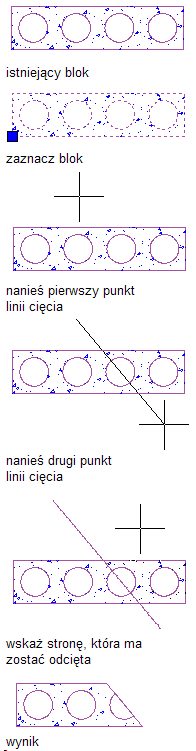 Procedura ta służy do ucinania kreskowań, linii, polilinii, łuków, okręgów, wielokątów AEC, wyciągnięć elementów bryłowych, pomieszczeń lub dowolnych elementów bibliotecznych opartych na blokach (w tym komponenty szczegółów) wykonanych dla tego typu szkiców lub obiektów.