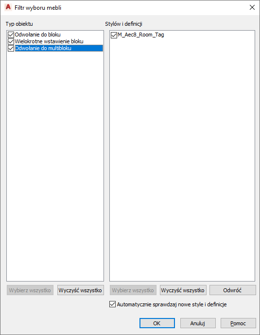 - Jeśli nowe style i definicje zostaną dodane do rysunku po obliczeniach ilości dla pomieszczeń, opcja ta określa, że nowe style i definicje mają być automatycznie uwzględniane w następnych obliczeniach. Domyślnie ta opcja jest aktywna.
