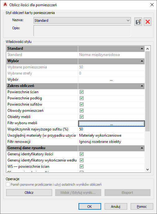 Obliczenie ilości dla pomieszczeń umożliwia określenie, które style umeblowania mają być obliczane.