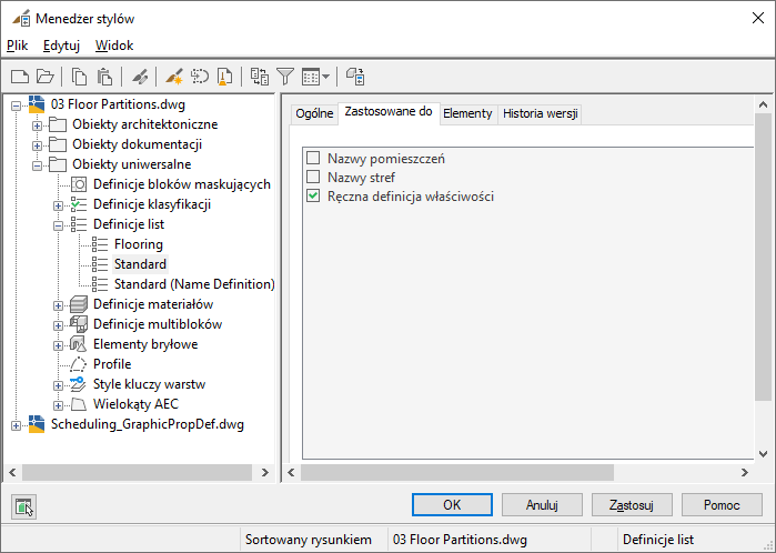 Uwaga: Definicje list mogą być również tworzone dla nazw pomieszczeń i stref.
