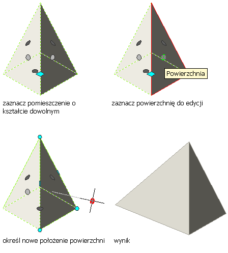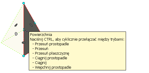 | przesuwać powierzchnię w dowolnym kierunku z rozciąganiem przylegających powierzchni | kliknij i przytrzymaj uchwyt powierzchni, naciśnij jednokrotnie Ctrl i określ nowe położenie. |
