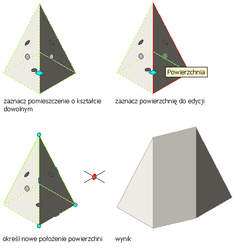 | przesunąć powierzchnię pomieszczenia prostopadle z rozciąganiem przylegających powierzchni | kliknij uchwyt powierzchni. Następnie przesuń ją do nowego położenia. |