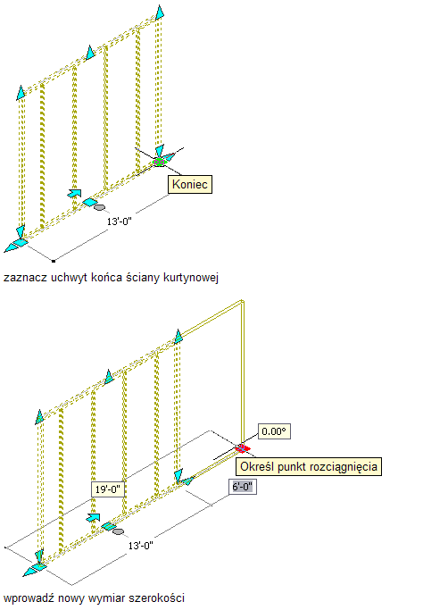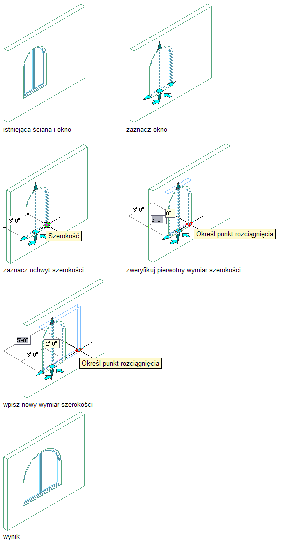 Na uchwytach są wyświetlane trzy rodzaje wymiarowania dynamicznego: