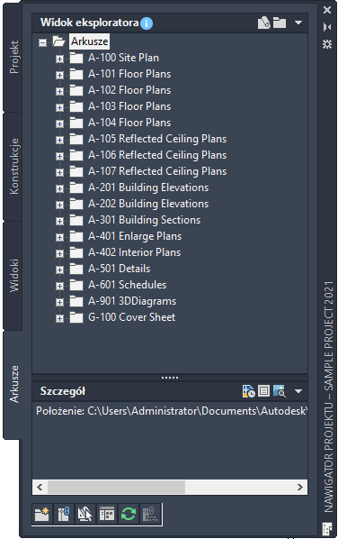 Podstawowym kategoriom odpowiadają foldery w Eksploratorze rysunków w strukturze projektu, która pomaga w organizacji plików projektu zgodnie z dyscyplinami, typami rysunków lub aspektami przepływu pracy.