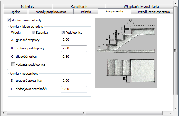 Uwaga: Jeżeli opcja Możliwe różne schody jest zaznaczona, zmiany na tej karcie nie spowodują zmian istniejących schodów. Aby dopasować te schody do ustawień stylu, należy wybrać schody, wyświetlić ich właściwości, wyświetlić arkusz Komponenty, a następnie kliknąć opcję Przywróć wartości stylu.