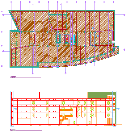 Rzut kondygnacji (góra) i przekrój budynku (dół)