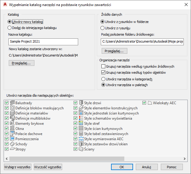 Uwaga: Jeśli obie opcje są włączone, katalog najpierw grupowany jest wg rysunków, a następnie wg typów obiektów, program tworzy zatem kategorie z rysunków i palety z typów obiektów. Rozwiązanie takie przyjęto, ponieważ palety nie mogą być zagnieżdżone. W takiej sytuacji przyciski opcji dla kategorii i palet są wyłączone, a dla kategorii wybrana jest opcja tworzenia narzędzi w paletach.