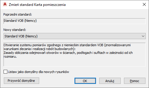 W przypadku wybrania tej opcji „Nowy standard” będzie używany jako domyślny dla wszystkich nowych rysunków. Istniejące rysunki zachowają swoje standardy.