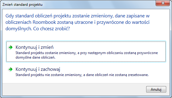 Anuluj, naciskając przycisk Nie, jeśli nie chcesz zmieniać standardu, ale chcesz zachować poprzedni. Wszystkie uprzednio wykonane obliczenia programu Roombook i ręczne dopasowania pozostaną niezmienione.