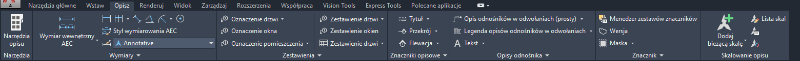 - Znaczniki opisowe. Ten panel zawiera polecenia służące do umieszczania znaczników tytułu, przekrojów, elewacji oraz rzutów szczegółu.
