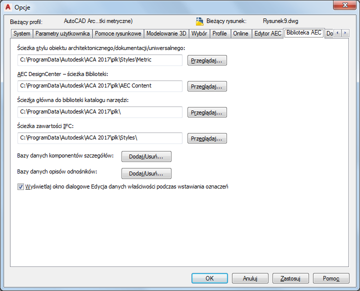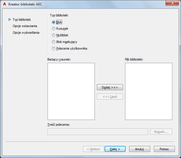 Wszystkie elementy biblioteczne z wyjątkiem linii odniesienia, znaczników opisowych i znaczników tytułów powinny być tworzone za pomocą Kreatora bibliotek AEC i przechowywane jako biblioteka AEC, tak aby można je było udostępnić albo za pośrednictwem karty „Biblioteka AEC” w Centrum projektowania, albo za pośrednictwem narzędzia na palecie.