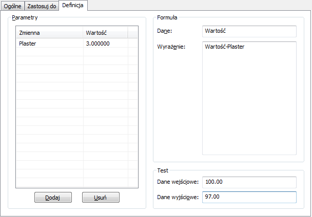 Chcemy na przykład ustawić 3-proc. odjęcie powierzchni tynku; zdefiniowaliśmy zmienną Odjęcie_powierzchni_tynku o wartości 0,97, wprowadzamy zatem AreaValue * Odjęcie_powierzchni_tynku.