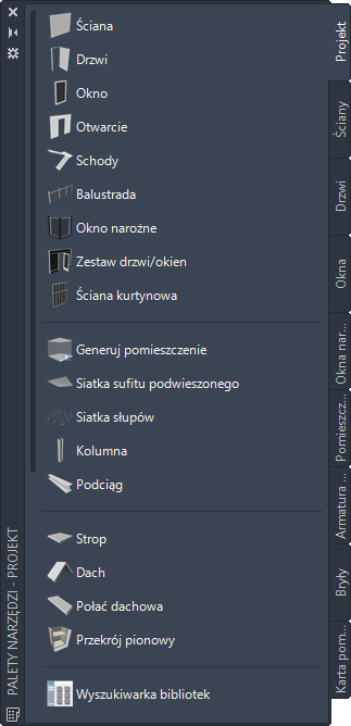 | Niestandardowe palety narzędzi utworzone przez administratora programu CAD | Narzędzia o stylach i właściwościach zestawów drzwi/okien dopasowane przez administratora programu CAD do realizowanych projektów lub norm obowiązujących w firmie. |