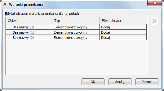 Uwaga: Arkusz umożliwia także usunięcie warunku przenikania poprzez kliknięcie prawym przyciskiem myszy wartości Obiekt lub Typ i wybranie polecenia Usuń. Alternatywną metodą jest użycie karty kontekstowej stropu lub połaci dachowej w sposób opisany w temacie „Aby usunąć warunki przenikania stropu/połaci dachowej”. Podczas usuwania warunku przenikania usuwane jest powiązanie pomiędzy stropem lub połacią dachową a obiektem, który został użyty do utworzenia warunku przenikania. Obiekt nie jest usuwany z rysunku.