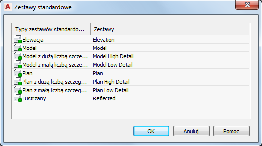 . W kolumnie Typy zestawów standardowych wyświetlane są domyślne zestawy wyświetlania dla rysunku. W kolumnie Zestawy wyświetlany jest zestaw wyświetlania dla każdego domyślnego zestawu wyświetlania.