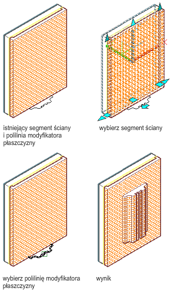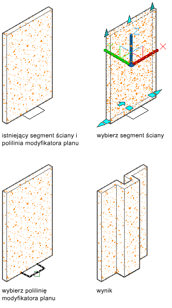 Procedura ta służy do tworzenia modyfikatora ściany z otwartej polilinii. Należy narysować polilinię w miejscu modyfikatora ściany lub rzutować tworzony modyfikator na ścianę. Nie można zamknąć polilinii.