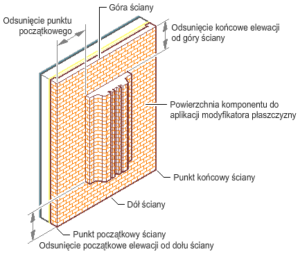 określić początkową wysokość modyfikatora ściany wprowadź wartość odsunięcia początku elewacji i określ, czy odsunięcie ma zostać wykonane od góry ściany, wysokości bazowej ściany, linii wyrównania ściany, czy od dołu ściany.