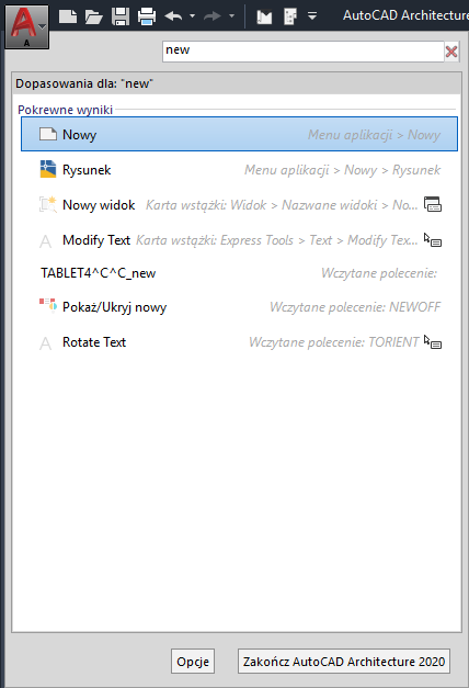 Menu aplikacji umożliwia wyszukanie polecenia, a następnie wybranie go z listy zgodnych pozycji. Wyniki wyszukiwania pobierane są z następujących miejsc: