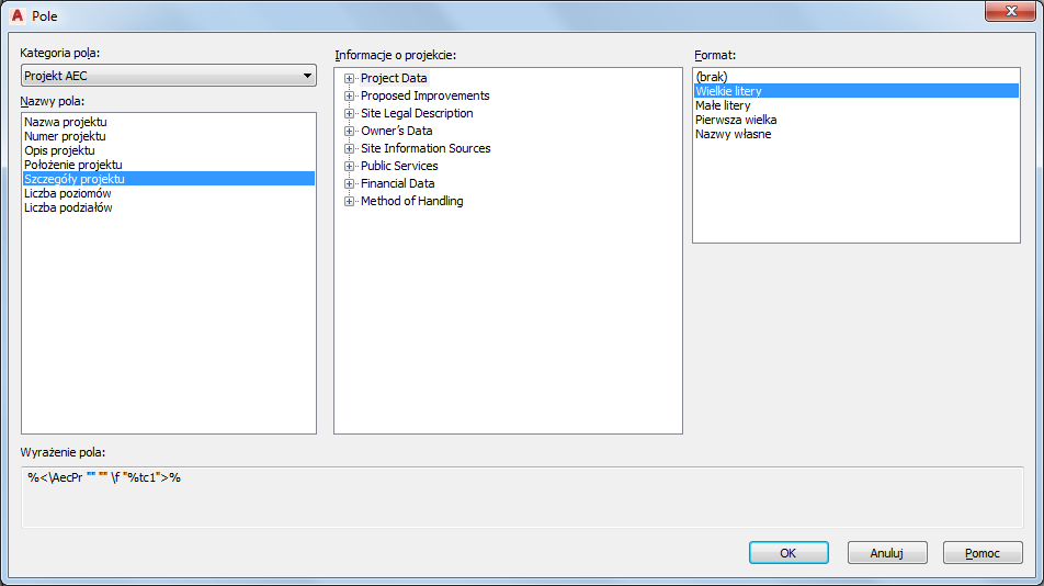 | wstawić pole projektu do elementu tekstu | patrz opis procedury „Aby wstawić pola w tekście programu AutoCAD”. |