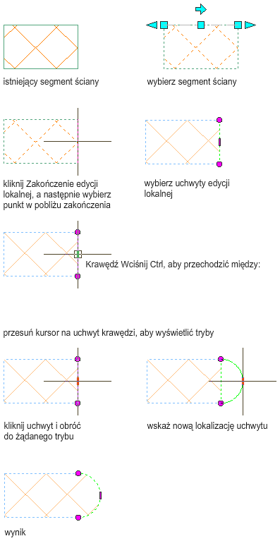 Ta procedura umożliwia przekształcanie krawędzi komponentu ściany w łuk za pomocą uchwytów wierzchołków.
