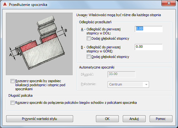 | dodać odległość do pierwszej stopnicy po górnej stronie spocznika | wpisz wartość w polu Odległość do pierwszej stopnicy w górę. Aby przedłużyć spocznik w dół o jedną stopnicę, zaznacz opcję Dodaj głębokość stopnicy. |