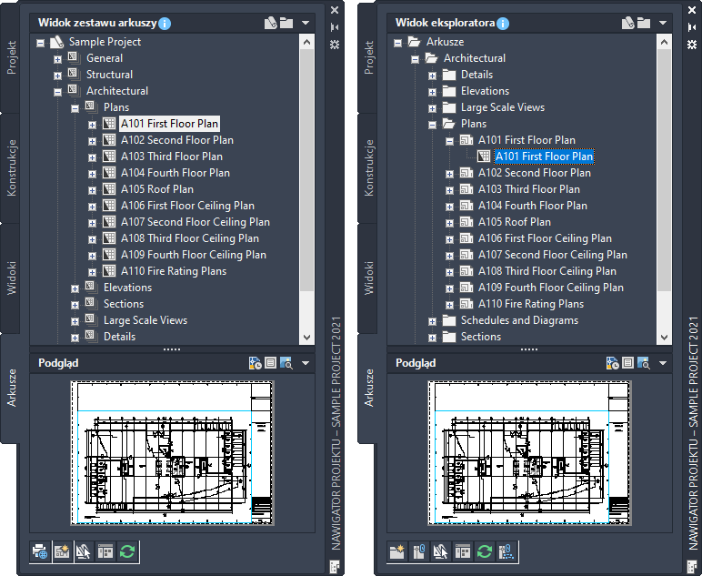 Karta Arkusz z oknem Widok zestawu arkuszy projektu (lewa strona) i oknem Widok eksploratora (prawa strona)