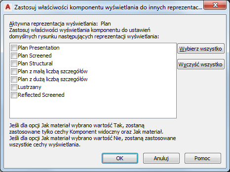 - W arkuszu zaznacz reprezentacje wyświetlania, do których mają zostać zastosowane zmiany, i kliknij przycisk OK.