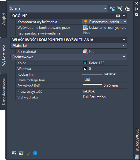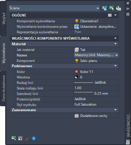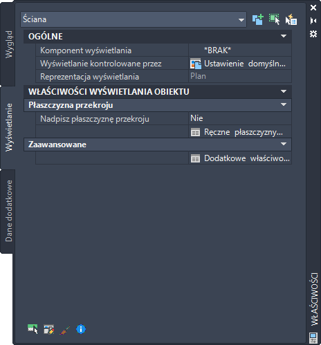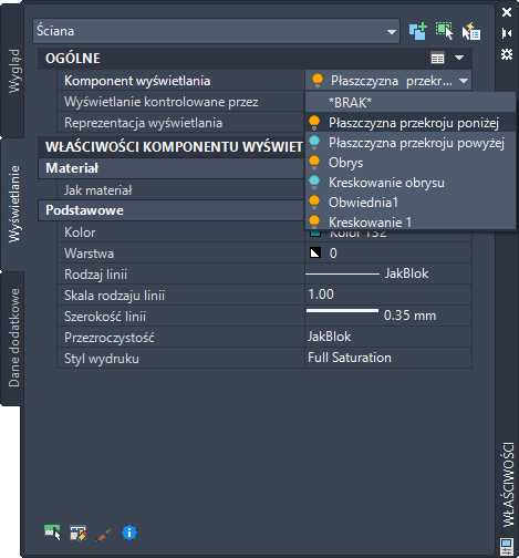 Opcje zawarte w palecie właściwości na karcie Wyświetlanie umożliwiają zmianę ustawień wybranego obiektu w bieżącej reprezentacji wyświetlania. Można zmieniać ustawienia właściwości, które dotyczą obiektu jako całości (jak wysokość płaszczyzny przekroju), jak również ustawienia poszczególnych komponentów wyświetlania obiektu (jak kolor, warstwa i rodzaj linii w przypadku komponentu kreskowania).