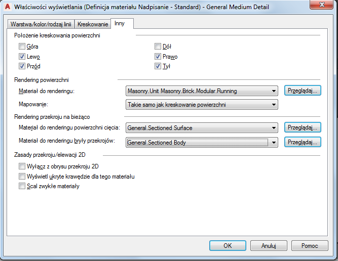 umożliwia dostęp do okna dialogowego, w którym można wyświetlić i zmodyfikować właściwości wyświetlania skojarzone z definicją materiału, takie jak pokazane poniżej położenie kreskowania powierzchni i rendering powierzchni.