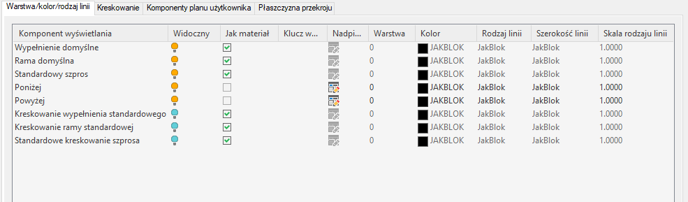 | na wysokości mniejszej niż wartość parametru Wysokość płaszczyzny tnącej | obiekty będą wyświetlane z użyciem ustawień komponentu Poniżej płaszczyzny tnącej określonych na karcie Warstwa/kolor/rodzaj linii. |