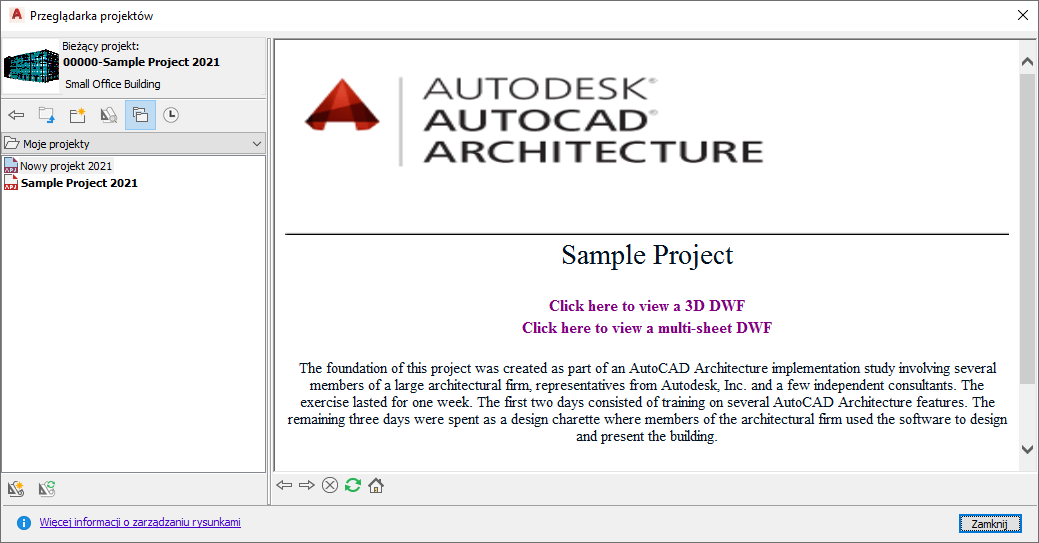 W Przeglądarce projektów można utworzyć nowe projekty, skonfigurować ustawienia projektu i standardy projektowe, dodać informacje szczegółowe oraz aktualny projekt. Podczas ustawiania bieżącego projektu z menu kontekstowego lub przez kliknięcie dwukrotne nazwy pliku projekt przekształcany jest w format zgodny z bieżącą wersją zestaw narzędzi AutoCAD Architecture 2027. Jeśli również zostaną zaktualizowane ścieżki projektu, wszystkie rysunki projektu również zostaną przekształcone i projektu nie będzie można otworzyć w starszej wersji oprogramowania.