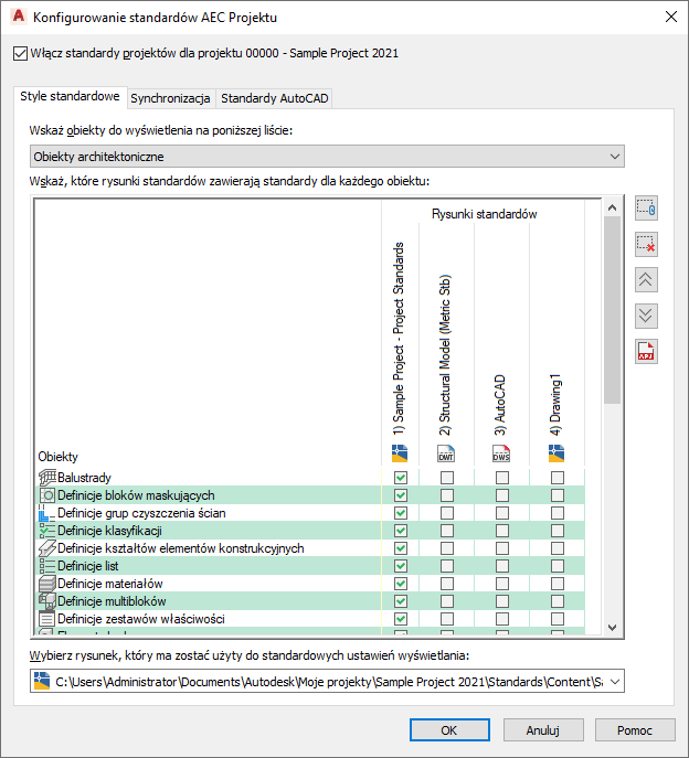 W celu ustawienia standardowych stylów i ustawień wyświetlania należy zdefiniować jeden lub więcej rysunków standardów projektu, zawierających standardy stylów i ustawień wyświetlania. Rysunki te mogą być plikami DWG, DWT lub DWS i dodawane są w oknie dialogowym konfiguracji.