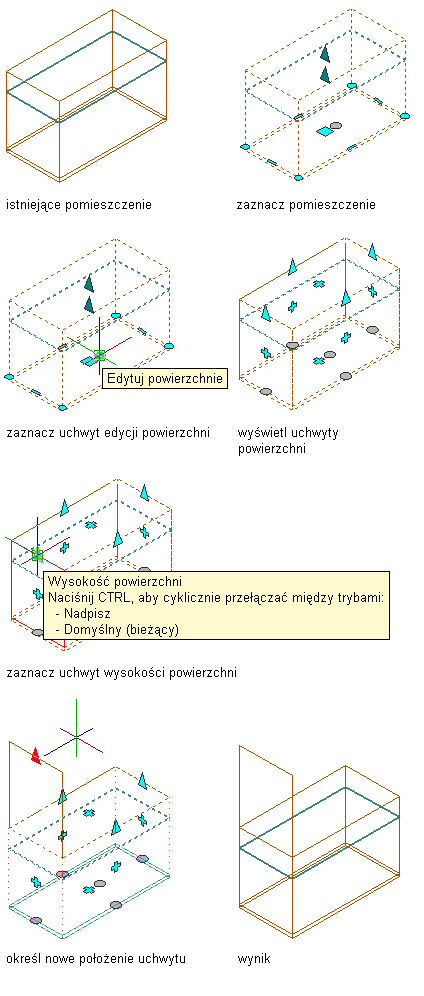 Ta procedura umożliwia edycję poszczególnych powierzchni wyciągniętego pomieszczenia 3D za pomocą uchwytów.
