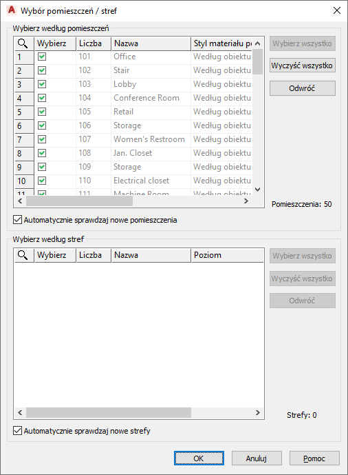 Na liście będą wyświetlane wszystkie strefy na rysunku. Domyślnie wybrane są wszystkie strefy uwzględnione w obliczeniach. Usuń zaznaczenie pola wyboru, jeśli pomieszczenie nie ma być obliczane. W wyniku wyboru według stref wszystkie odpowiadające im pomieszczenia zostaną wybrane automatycznie.