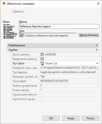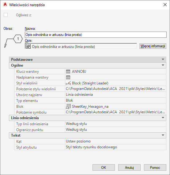 . Narzędzia wstawiania opisów odnośników wywodzą się z prostych narzędzi opisu i mogą być dostosowywane za pomocą arkusza Właściwości narzędzia dostępnego w ich menu kontekstowym.