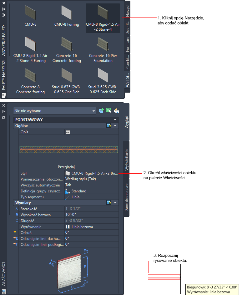 Narzędzia zwykle mają wstępnie ustawione parametry tworzenia, nazywane właściwościami lub właściwościami. Po kliknięciu narzędzia obiektu w celu dodania obiektu do rysunku zostanie otwarta paleta Właściwości, na której można zmienić właściwości nowych obiektów. Jeżeli właściwości obiektu nie powinny być zmieniane, można po prostu umieścić obiekt na rysunku.