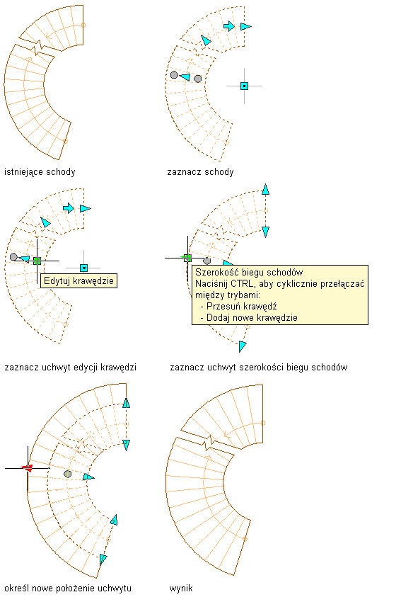 - Kliknięcie uchwytu Szerokość biegu schodów i naciśnięcie klawisza Ctrl spowoduje zachowanie punktu środkowego schodów oraz uchwytów zewnętrznych. W ten sposób ulega zmianie kształt schodów.