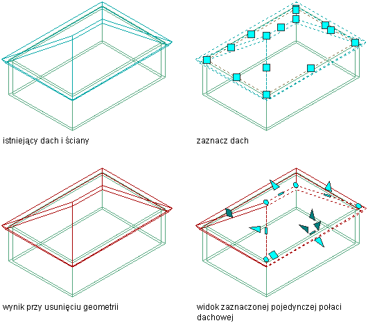 Opisana poniżej procedura umożliwia przekształcenie powierzchni istniejącego obiektu dachu w odrębne połacie dachowe o właściwościach wybranego narzędzia obróbki połaci dachowych. Połacie dachowe i ich krawędzie można modyfikować oddzielnie.